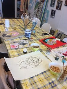 We gaan de schetsen samen bekijken en de mooiste wordt individueel uitgewerkt op een klein schildersdoek met acrylverf.