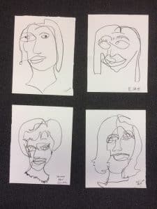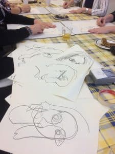 In deze gezellige workshop ga je op een speelse manier portretten van elkaar maken. We starten met het maken van schetsen van elkaar door middel van blind tekenen; met houtskool teken je lijnen van het portret op je schetspapier zonder op je papier te kijken en zonder het stiftje van het papier los te laten. Je tekent de persoon die tegenover je zit en na iedere schets verander je van plaats.