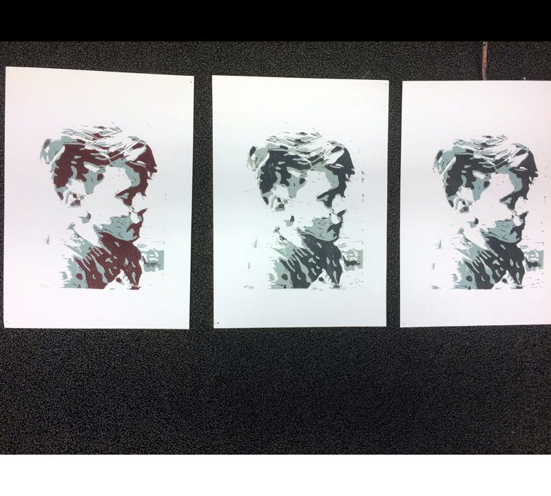 De tweede ochtend of dagdeel wordt er het tweede gedeelte weggesneden van de linoleum voor de volgende drukkleur.